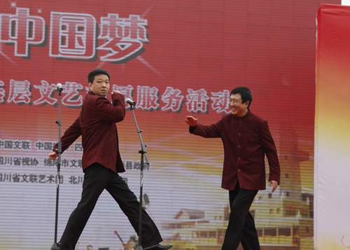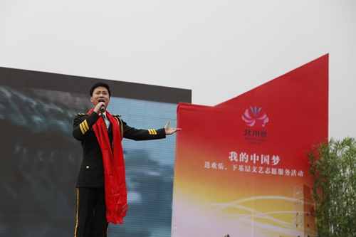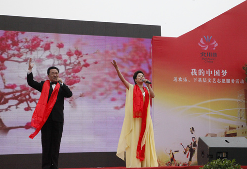 为贯彻党的十八届三中全会精神,践行党的群众路线,3月24日至25日,中国文联、中国电视艺术家协会、四川省文联共同主办了“我的中国梦——送欢乐、下基层文艺志愿服务”活动,在四川省电视艺术家协会、绵阳市文联、中共北川县委、北川县人民政府的承办支持下,来自八一电影制片厂、总政歌剧团、中国广播艺术团、中国电影集团、中国铁路文工团、全总文工团、海政电视艺术中心、二炮文工团、中国国家话剧院、中国歌剧舞剧院、中国煤矿文工团、四川省文联艺术团、四川省歌舞剧院、北川民族艺术团的一百多名艺术家、演员走进北川。