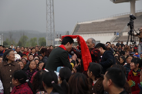 八一电影制片厂著名影视演员岳红甫一登台主持演出,全场立即掌声雷动;而当总政话剧团国家一级演员、周恩来总理扮演者刘劲出场,用“周总理”的口吻向北川人民问好,关切、鼓舞、祝福的话语如春风化雨,打动人心,立即引起北川群众的强烈共鸣,现场几近沸腾。