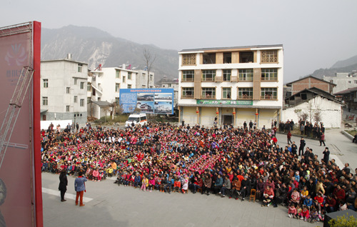 远处5.12特大地震造成的山体滑坡依稀可见,乡亲们就在简易的幕布前围坐观看演出。