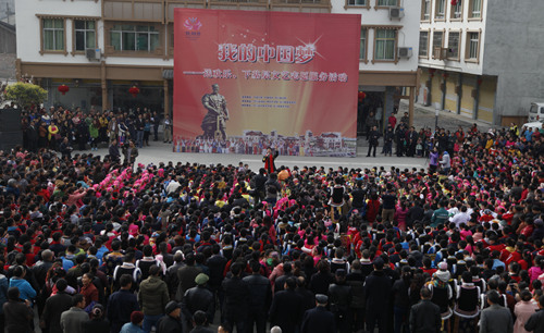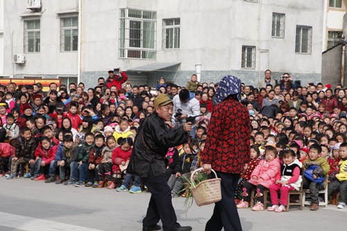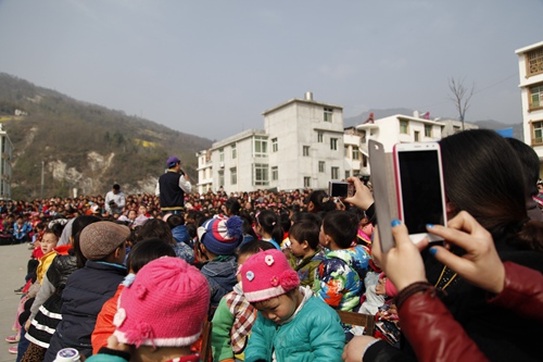 经过一晚上的休整,3月25日,文艺志愿服务团一行乘车来到禹里乡开展第二场演出。在乡上的坝子里搭起一块简易幕布,乡亲们相围而坐,将不算小的平坝子围得“水泄不通”。没有搭建舞台,艺术家们以操场为舞台;没有座椅,观众们一张张小凳子足矣。