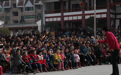 由著名金牌青年魔术师、中国魔术金奖获得者尹浩带来的魔术表演,使用简单、一目了然的道具,特邀小朋友参加魔术互动,激发了孩子们的好奇心,极为认真地观看每一个动作。神奇的魔术令乡亲们一边啧啧称奇、赞不绝口,却又百思不得其解。