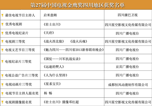 其中,第27届中国电视金鹰奖最佳主持人奖由中央电视台主持人朱迅和四川康巴卫视主持人启米翁姆获得,由四川星空影视文化传媒有限公司制作的电视剧《壮士出川》获得优秀电视剧奖,四川广播电视台制作的纪录片《天府》获得优秀电视纪录片奖,四川广播电视台杨畅获得第27届中国电视金鹰奖优秀主持人提名奖。《壮士出川》同时还获得了电视剧摄像提名奖。这是四川自2000年中国金鹰电视艺术节开办以来取得的最好成绩,更是四川电视行业繁荣发展所取得的重大突破。