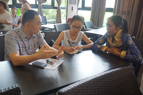 第九届四川省“十佳电视艺术工作者”与“影视小屋”师生结对子活动可谓是本次艺术课堂的一大亮点。“十佳”都是我省电视艺术领域里的优秀代表,为了充分发挥他们的专业技能,弘扬大爱精神,让“影视小屋”尽快出作品、出人才,做好文化扶贫工作,让每一个孩子都享有人生出彩的机会。“影视小屋”的师生们根据自己的兴趣与志向与“十佳”们结成对子。“十佳”代表凌中与甘孜州康定藏文中学学生四郎汪清、四郎泽仁结成了对子。他鼓励同学们要脚踏实地,积极创作。只要付出了努力,就一定有所收获。成都理工大学传播科学与艺术学院院长刘翼把自己的联系方式特地公布了出来。他告诉大家,凡是涉及到艺术类大专院校的招考信息,可以随时向他咨询。