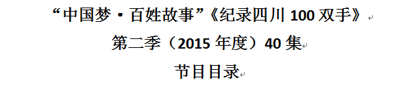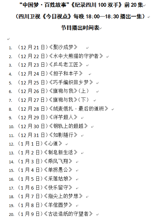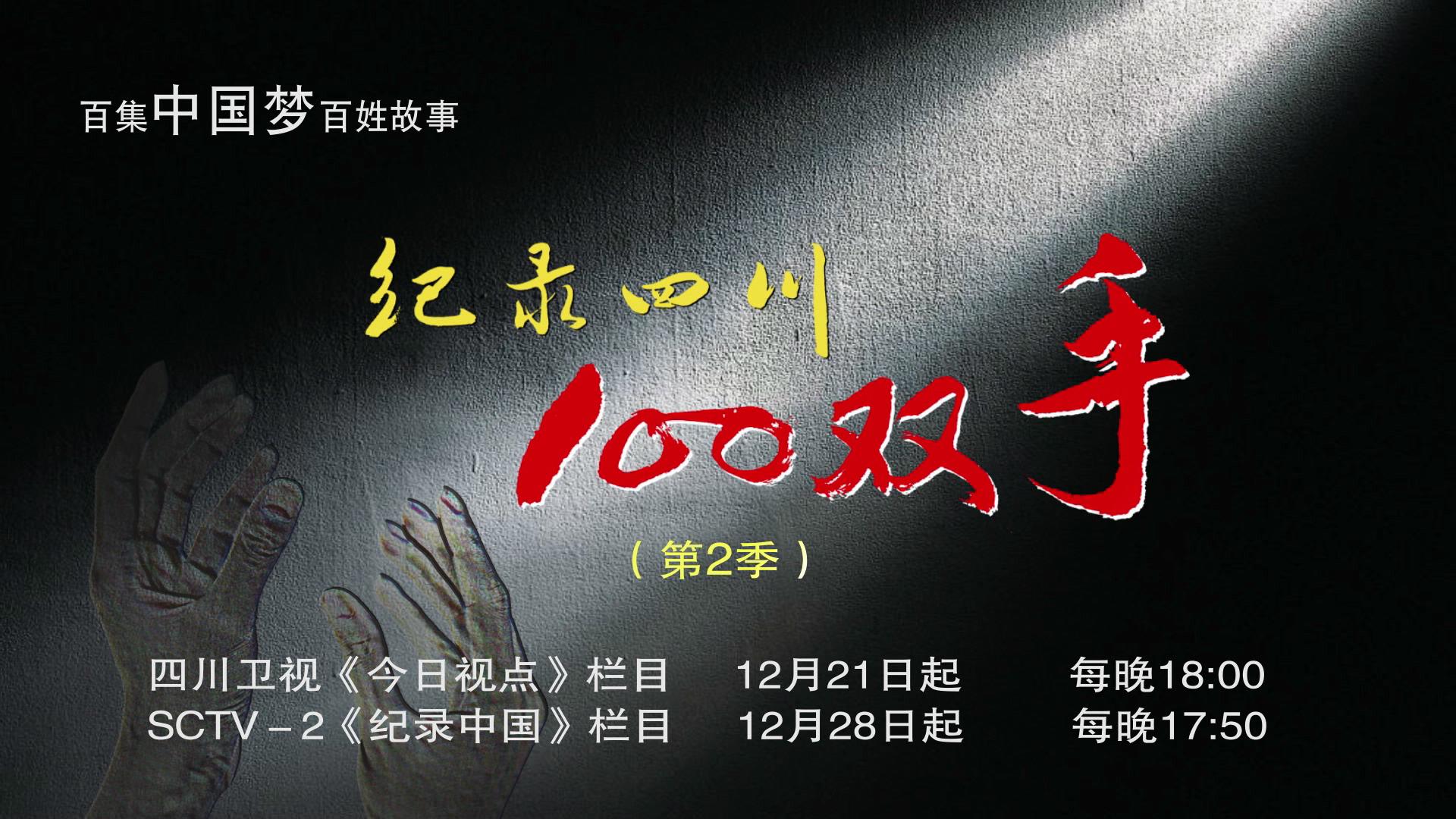 由四川广播电视台、四川省文联、四川省视协联合全省各市、州(县)电视台共同制作的大型系列纪录片《纪录四川100双手》第二季40集,将于12月21日起在四川卫视《今日视点》栏目隆重推出;随后于12月28日起在四川广播电视台文旅频道《纪录中国》栏目播出。这部被媒体称作“百集中国梦百姓故事”的大型系列纪录片,将以每天播出一集的形式,向社会展示普通四川人的追梦故事。