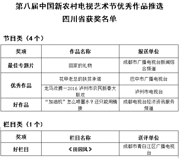 由四川省视协报送的作品中有五部作品脱颖而出,其中成都市广播电视台新闻综合频道的《回家的礼物》获得最佳专题片奖。