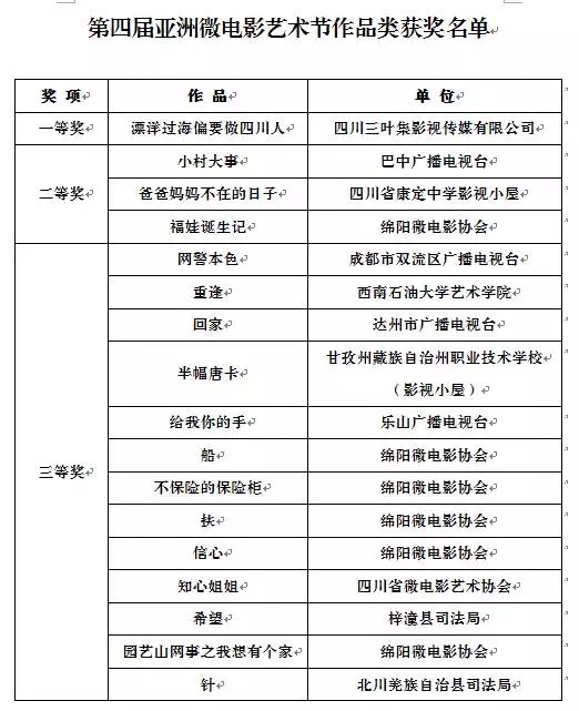 由四川省视协报送的微电影《漂洋过海偏要做四川人》荣获亚洲微电影节“金海棠”奖一等奖,微电影《小村大事》《爸爸妈妈不在的日子》《福娃诞生记》荣获“金海棠”奖二等奖,《网警本色》《回家》《半幅唐卡》等13部作品荣获“金海棠”奖三等奖。