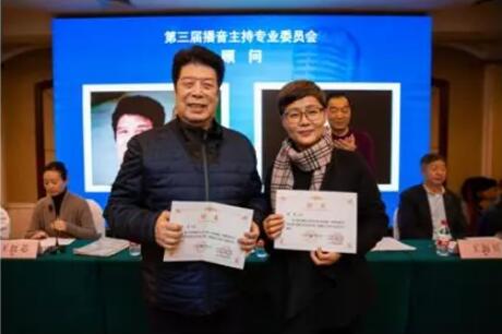 省视协第三届播音主持专委会顾问王雷、李蓉上台接受聘书。