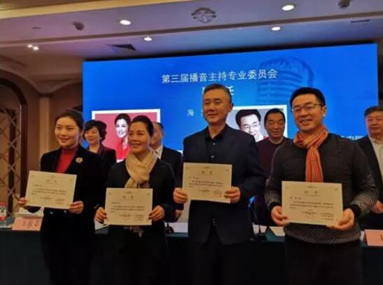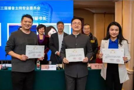 省视协第三届播音主持专委会秘书长陈岳,副秘书长张欣宇、徐波上台接受聘书。