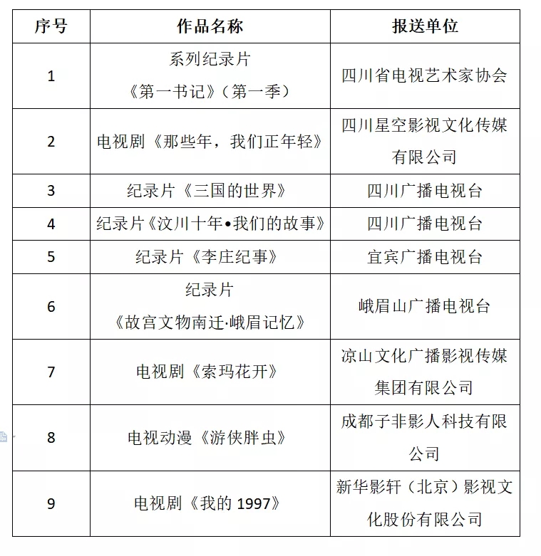 第九届四川省巴蜀文艺奖电视奖初评结果