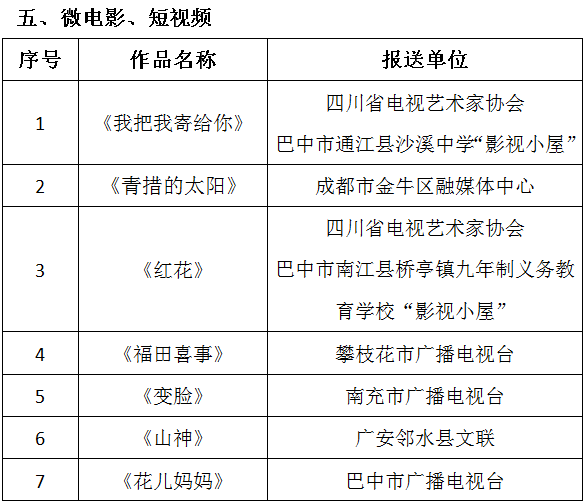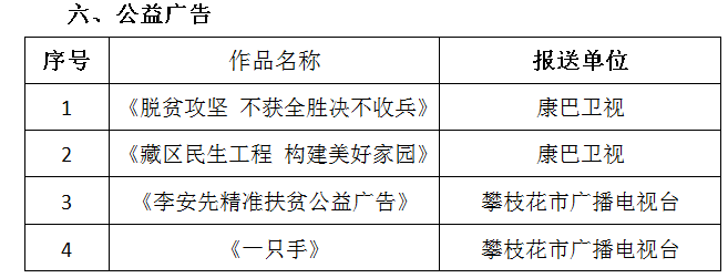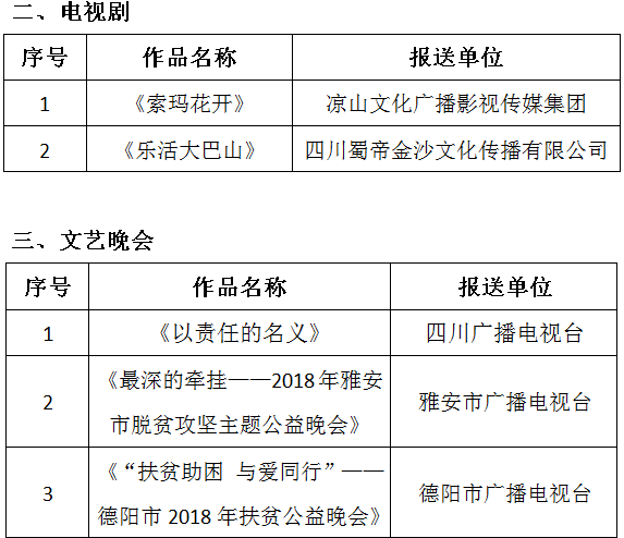 本次征集活动共收到来自团体会员单位的作品35件,四川省视协会同各级主管部门领导、业内专家学者组成了专业评审委员会。本着“公平、公开、公正”的原则,严格把关,认真评审,最终评选出电视纪录片、专题片12件,电视剧2件,文艺晚会3件,电视栏目6件,微电影、短视频7件,公益广告4件,歌曲MV1件。本次评选出的作品将由省视协统一报送四川省文联进行复评。